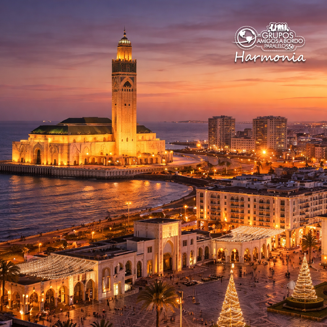 Café da manhã. Após o café da manhã, início de uma visita guiada pela cidade de Casablanca, explorando seus principais pontos de interesse. O destaque do dia é a impressionante Mesquita Hassan II, uma das maiores do mundo, localizada à beira do Oceano Atlântico. Em seguida, passeio pela Corniche, uma agradável área costeira repleta de cafés e restaurantes, e visita ao bairro Habous, conhecido por sua arquitetura tradicional e mercados locais. O tour também inclui uma passagem pela Praça Mohammed V, coração administrativo da cidade. Tarde livre para atividades pessoais ou compras. Jantar e hospedagem.