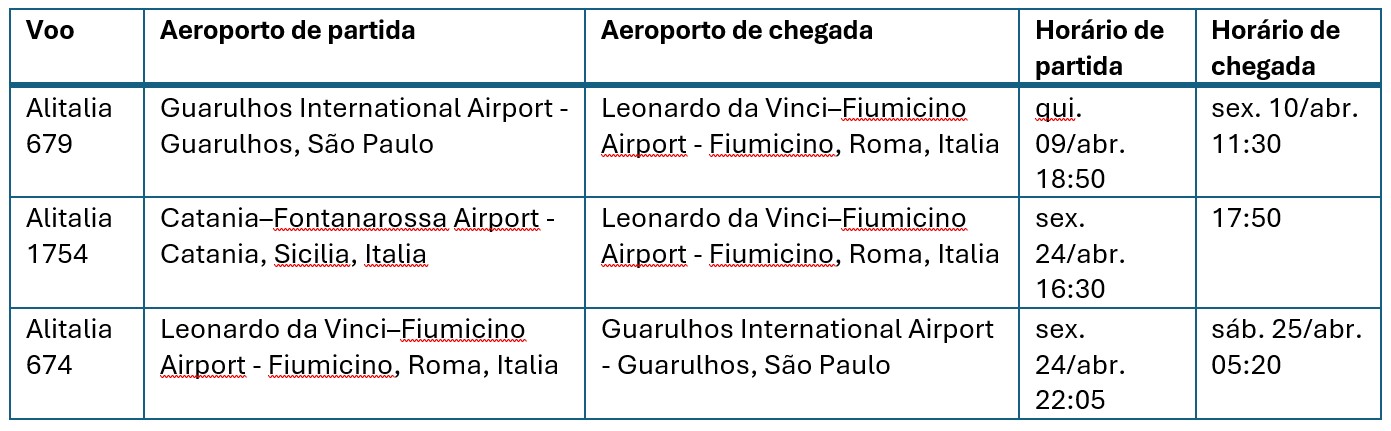 Apresentação no aeroporto de Porto Alegre para embarque com destino à Roma com conexão.